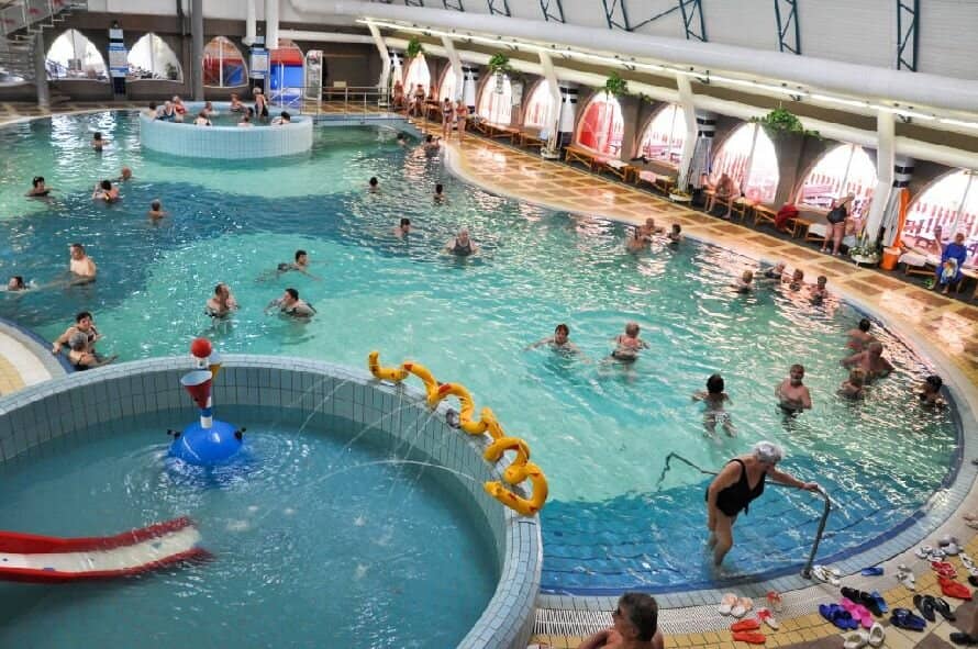 Bazény: Areál nabízí více než 9 bazénů (krytých i venkovních) s termální i užitkovou vodou – relaxační, dětské, plavecké i zážitkové s vodními atrakcemi.